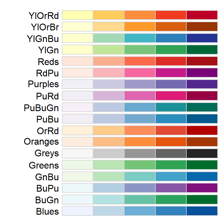 There are many color schemes to choose from, but you will probably want to stick to color swatches established by Cynthia Brewer. These palettes are available in tmap and their names are listed below.