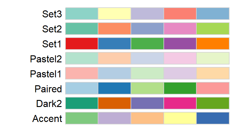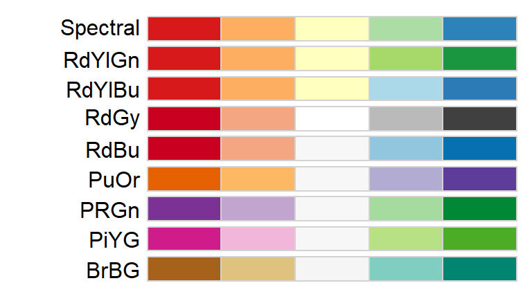 You can adopt Brewer’s color schemes by applying one of the scale_..._fermenter() functions and specifying the classification type (sequential, seq; divergent, div; or categorical, qual) and the palette name. For example, to adopt a divergent color scheme using the "PRGn" colors, type:
