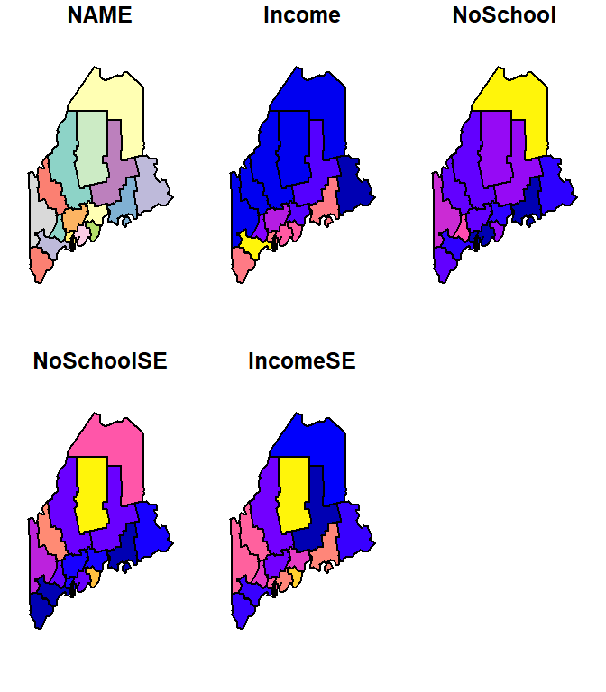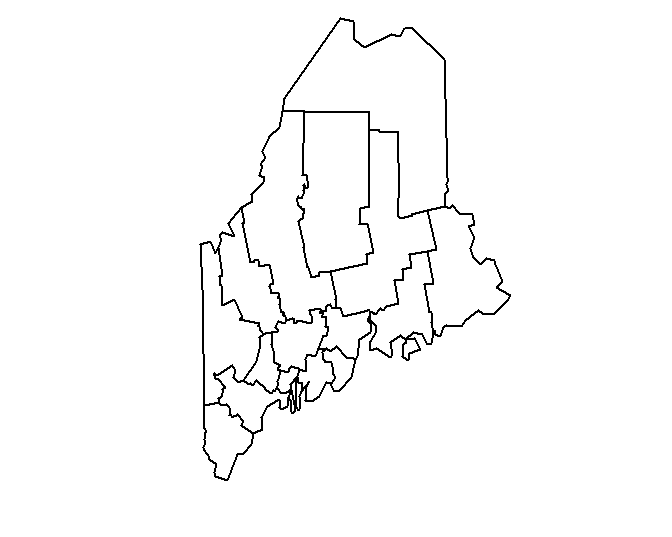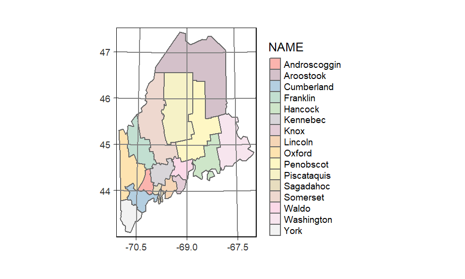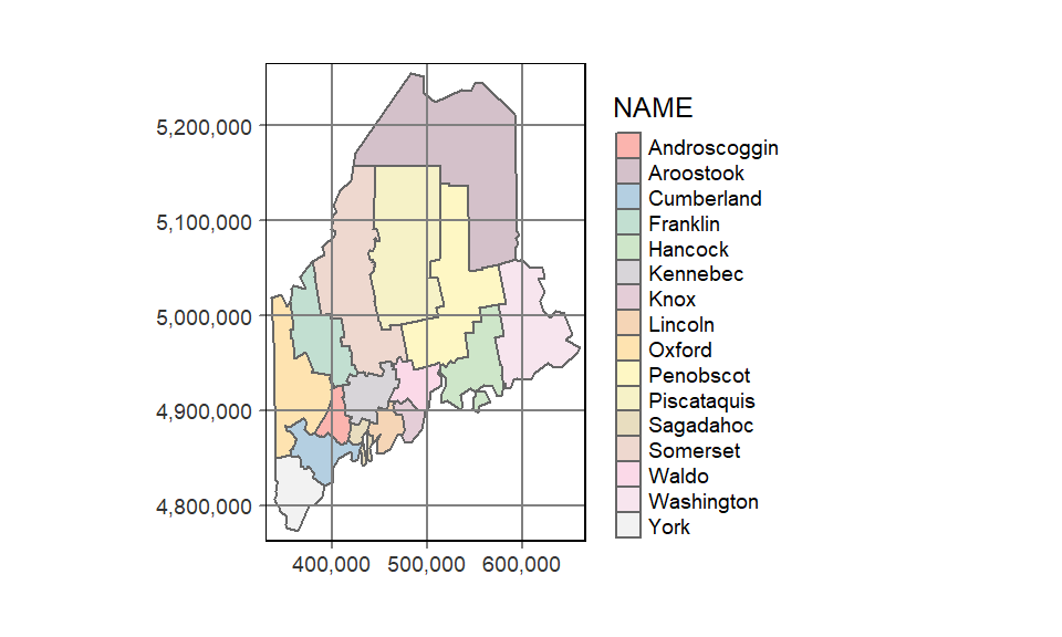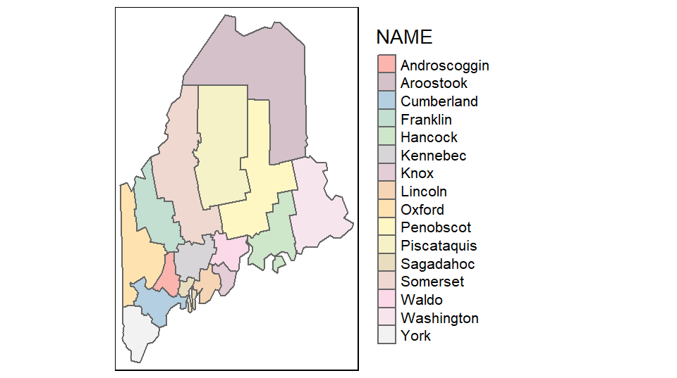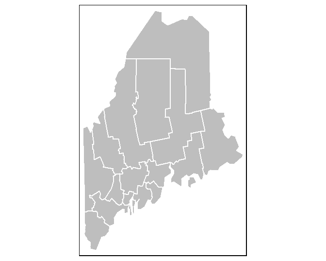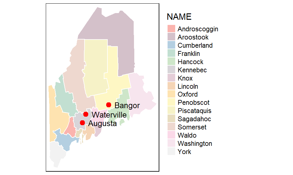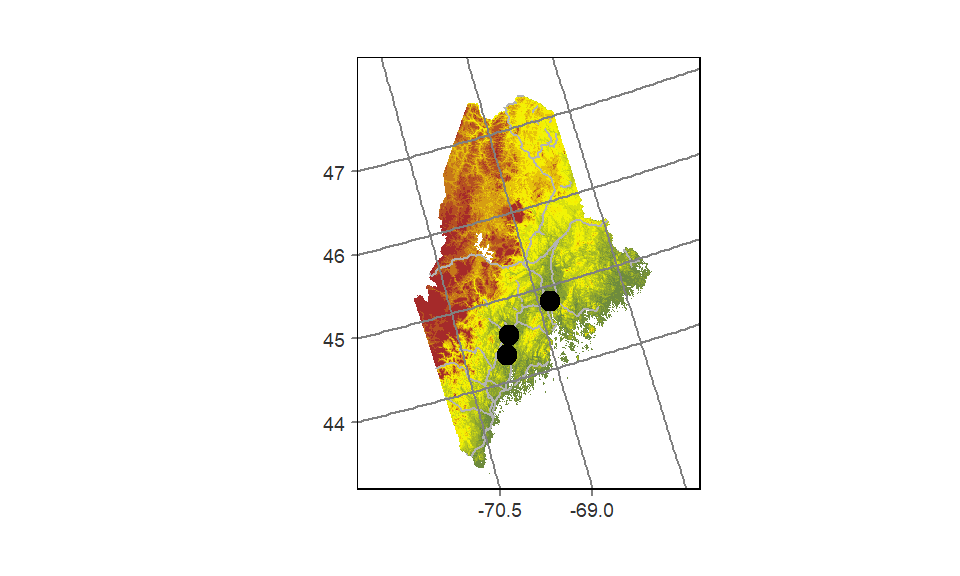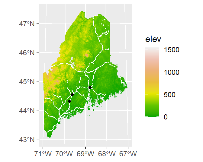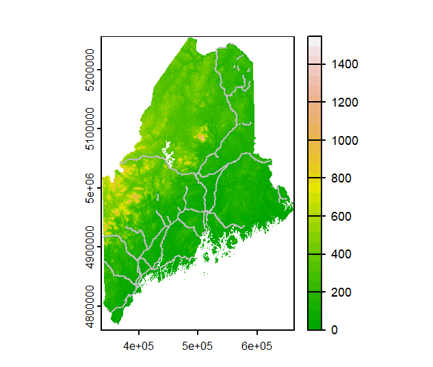 p.sf <- readRDS(z)The data objects consist of five layers: an elevation raster (elev.r), an interstate polyline layer (inter.sf), a point cities layer (p.sf), a railroad polyline layer (rail.sf) and a Maine counties polygon layer (s.sf). All vector layers are sf objects. All layers are in a UTM/NAD83 projection (Zone 19N) except p.sf which is in a WGS 1984 geographic coordinate system.