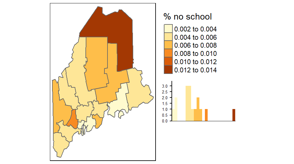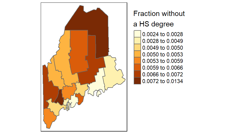To map the percentage of the population not having attained a high school degree (column labeled NoSchool in s.sf) using a YlOrBr palette with 8 bins while modifying the legend title to read “Fraction without a HS degree”, type: