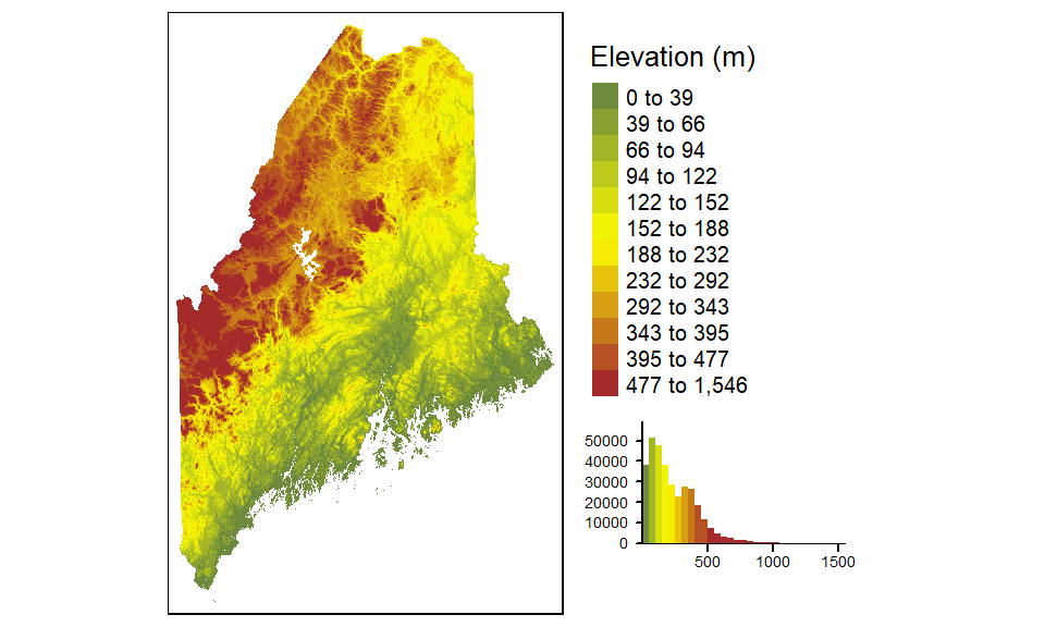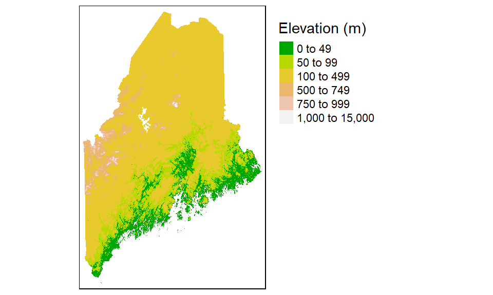 tm_raster(style = "fixed", title = "Elevation (m)",