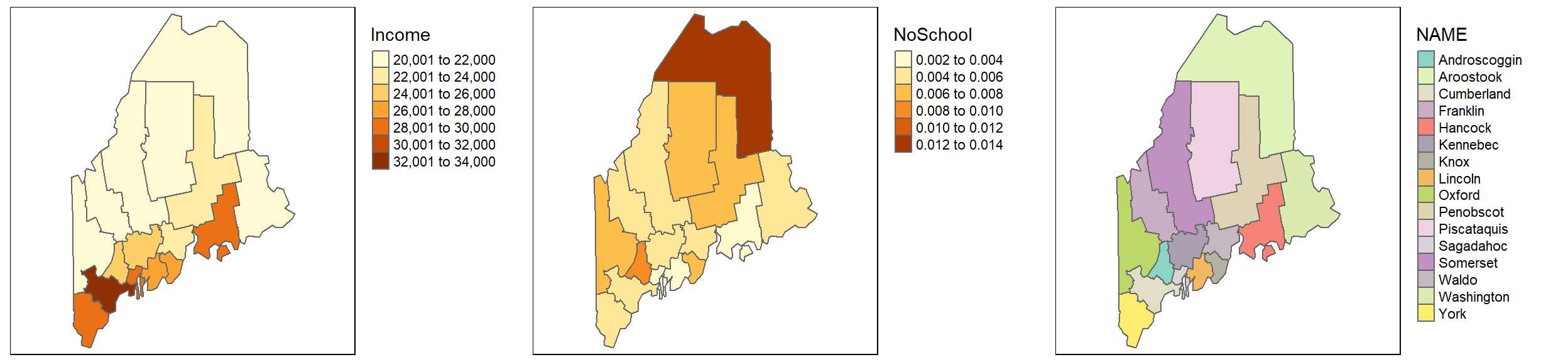 The tm_shape function loads the spatial object (vector or raster) into the mapping session. The tm_polygons function is one of many tmap functions that dictates how the spatial object is to be mapped. The col parameter defines either the polygon fill color or the spatial object’s attribute column to be used to define the polygons’ color scheme. For example, to use the Income attribute value to define the color scheme, type: