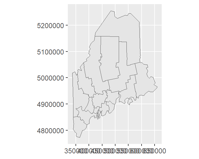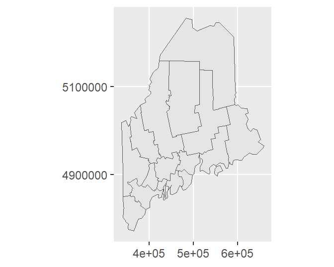 If you want to have ggplot adopt the layer’s native coordinate system (UTM NAD 1983 in this example) instead of the default geographic coordinate system, type: