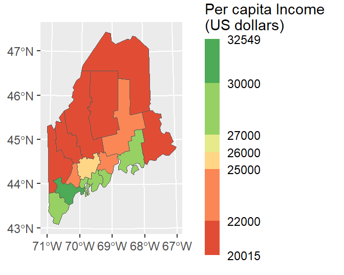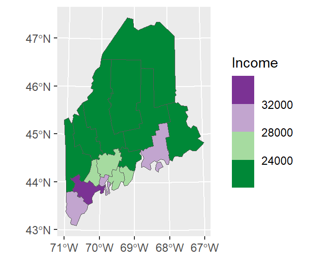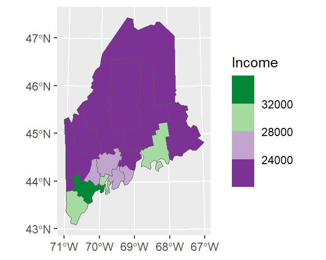 To bin the color scheme by assigning ranges of income values to a unique set of color swatches defined by hex values, use one of the scale_fill_steps* family of functions.